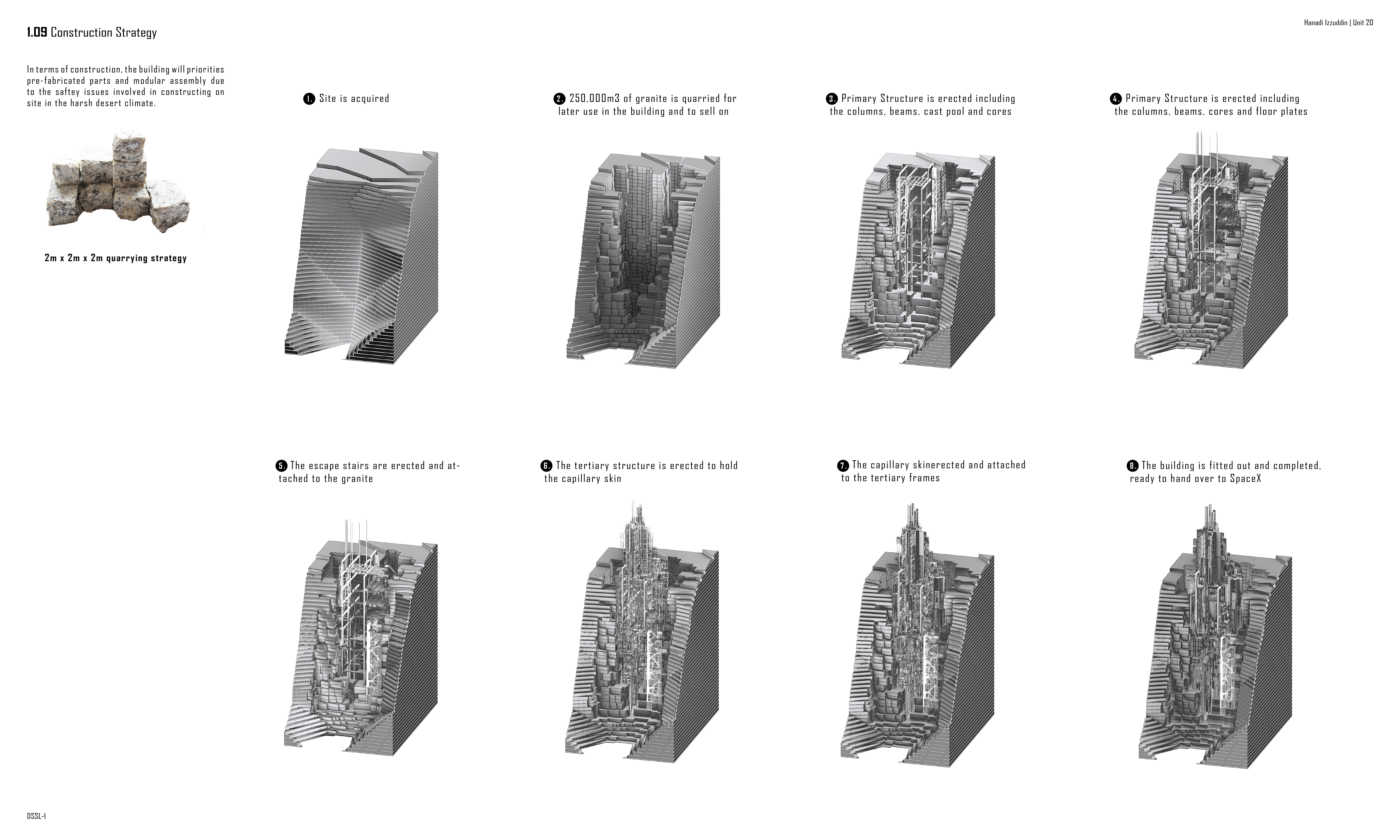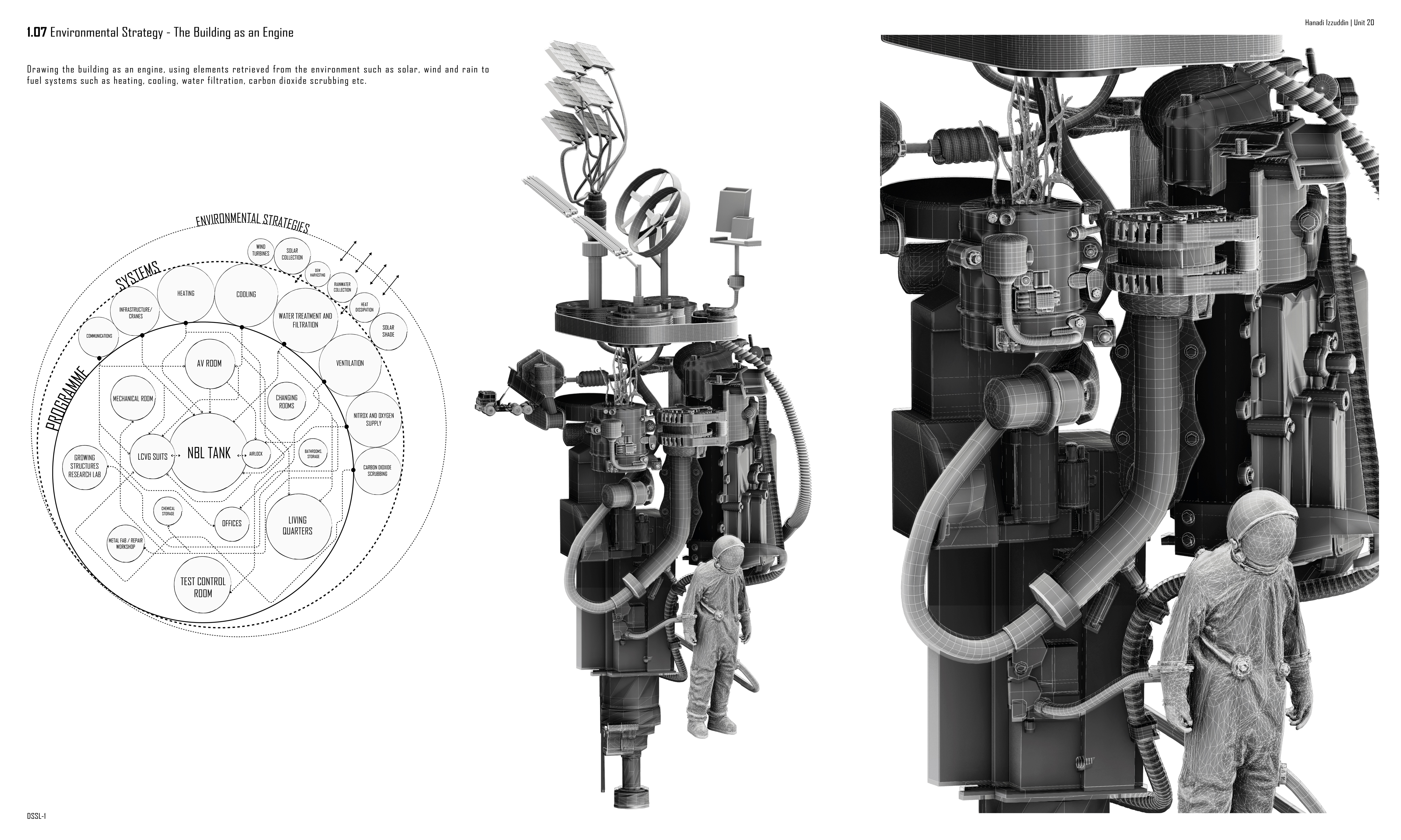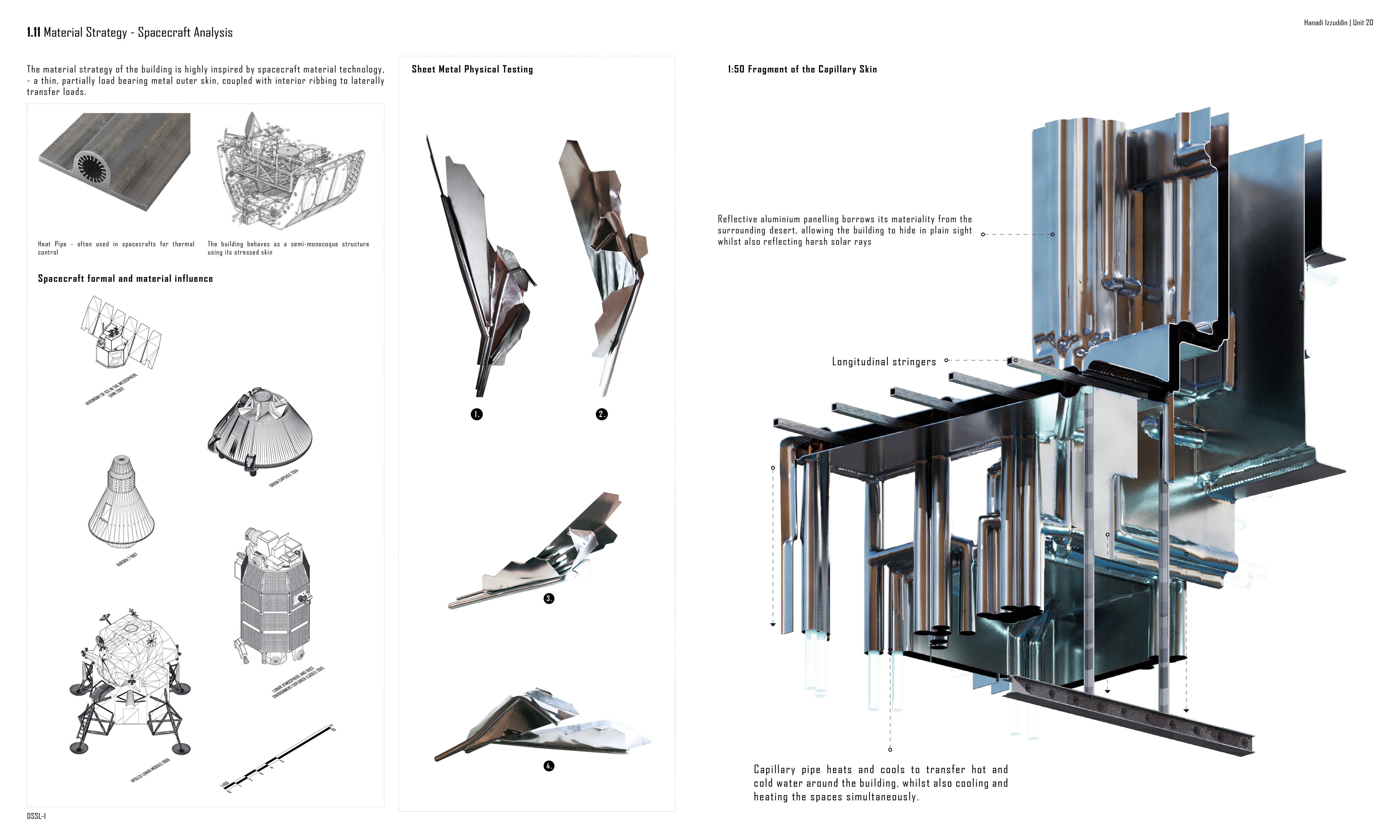 Deep Space Structures Laboratory (DSSL-1) draws on the embedded mechanical intelligence of the engine as it tests spacecraft technology through its own fabric, using its capillary skin and heat-transfer technology to cool the building using the desert’s extreme and varying climatic conditions - much like in outer space. Thus, the building begins to internalise an integral infrastructure whereby elements such as pipes, ducts and risers not only perform their functional purpose within the skin, but also begin to form part of the wider architectural language.