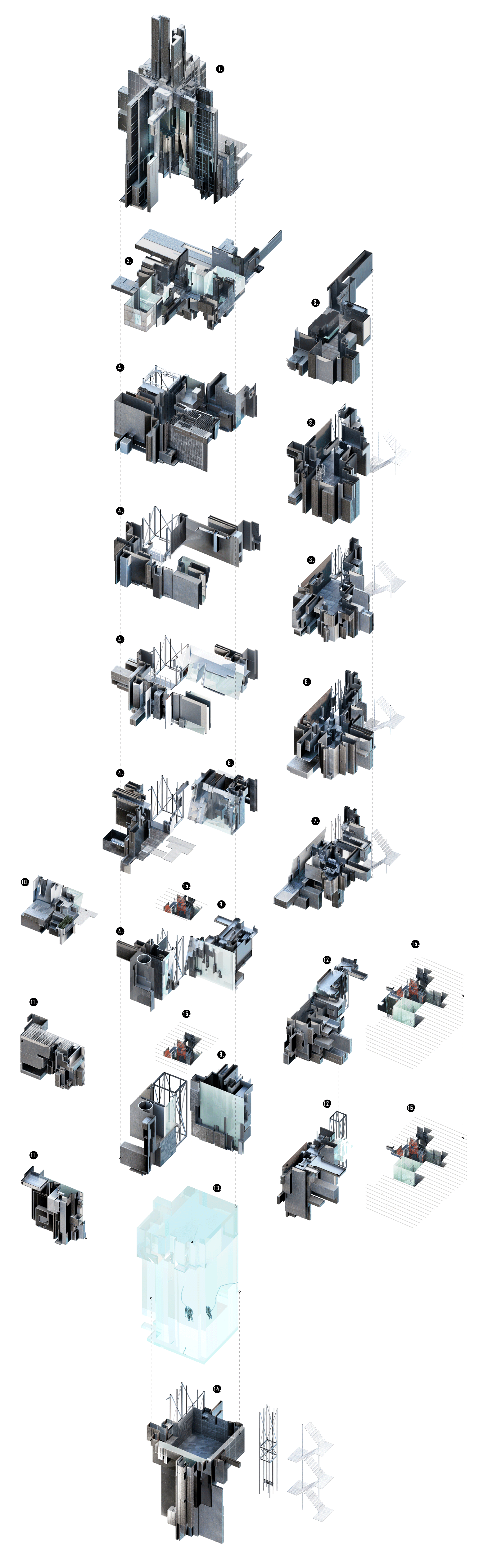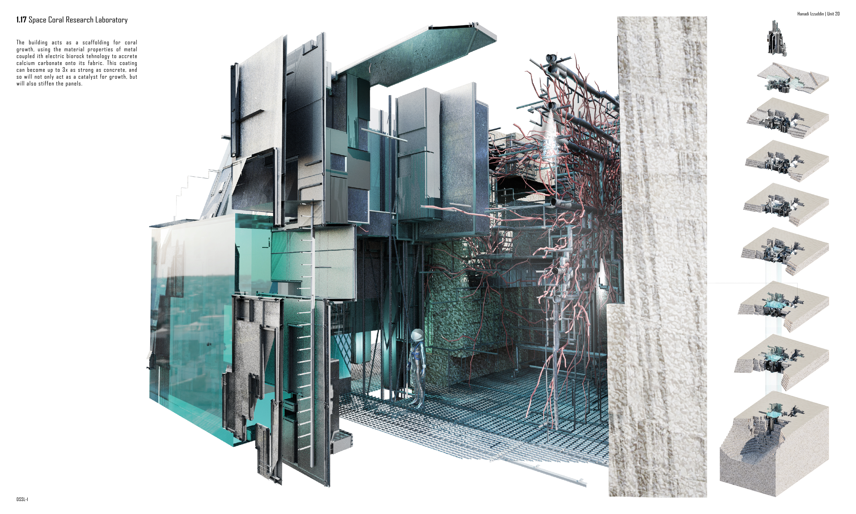 A private, classified programme is concealed within the fabric of the building - a Space Coral Research Laboratory. ‘Space Coral’ is proposed to be a genetically modified species of coral that is able to thrive outside of water, and does so using Electric Biorock Technology. The fabric of the building therefore facilitates research into the potential of growing structures in outer space, where we may not have the means to assemble structures like we do here on earth.