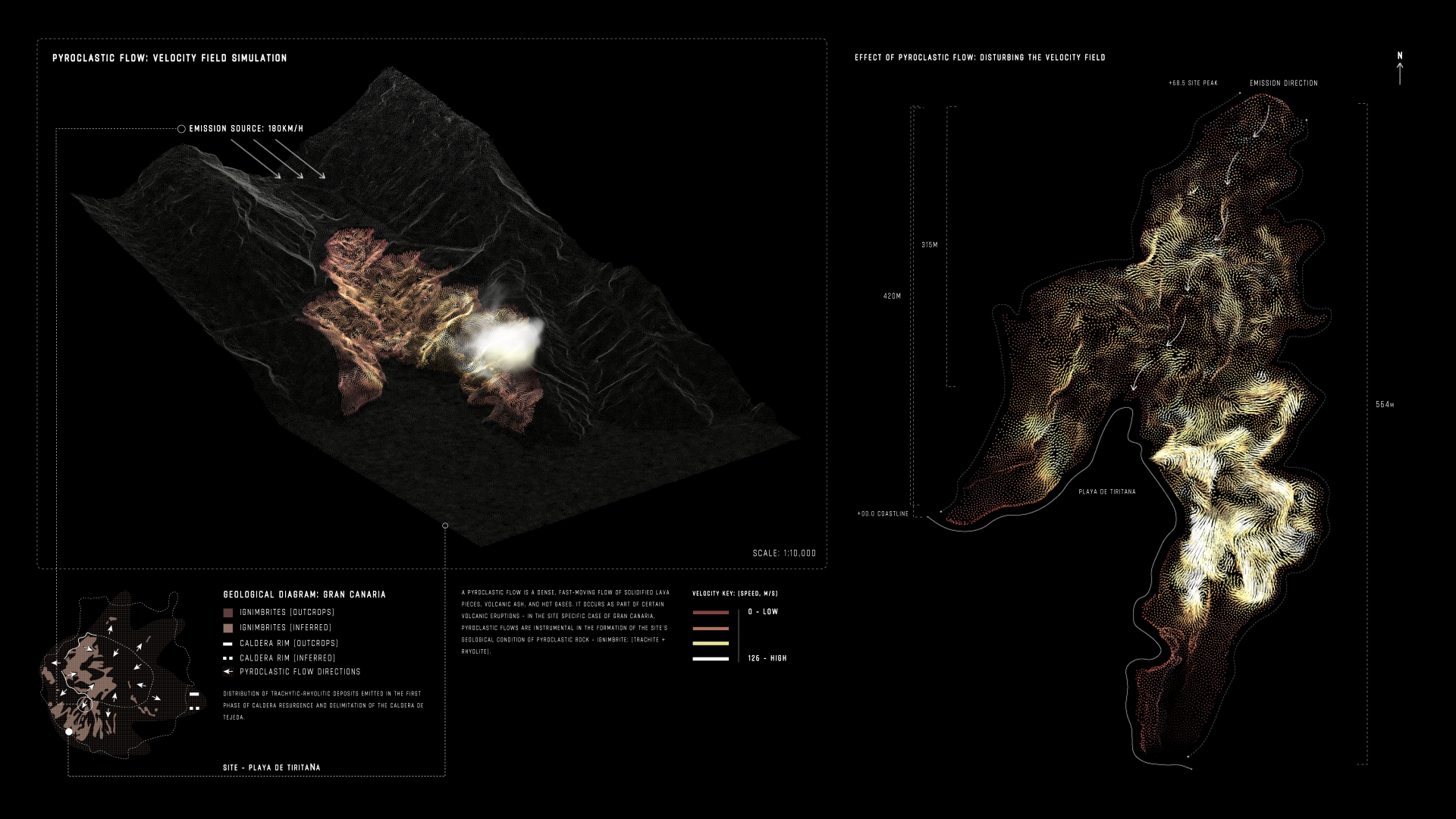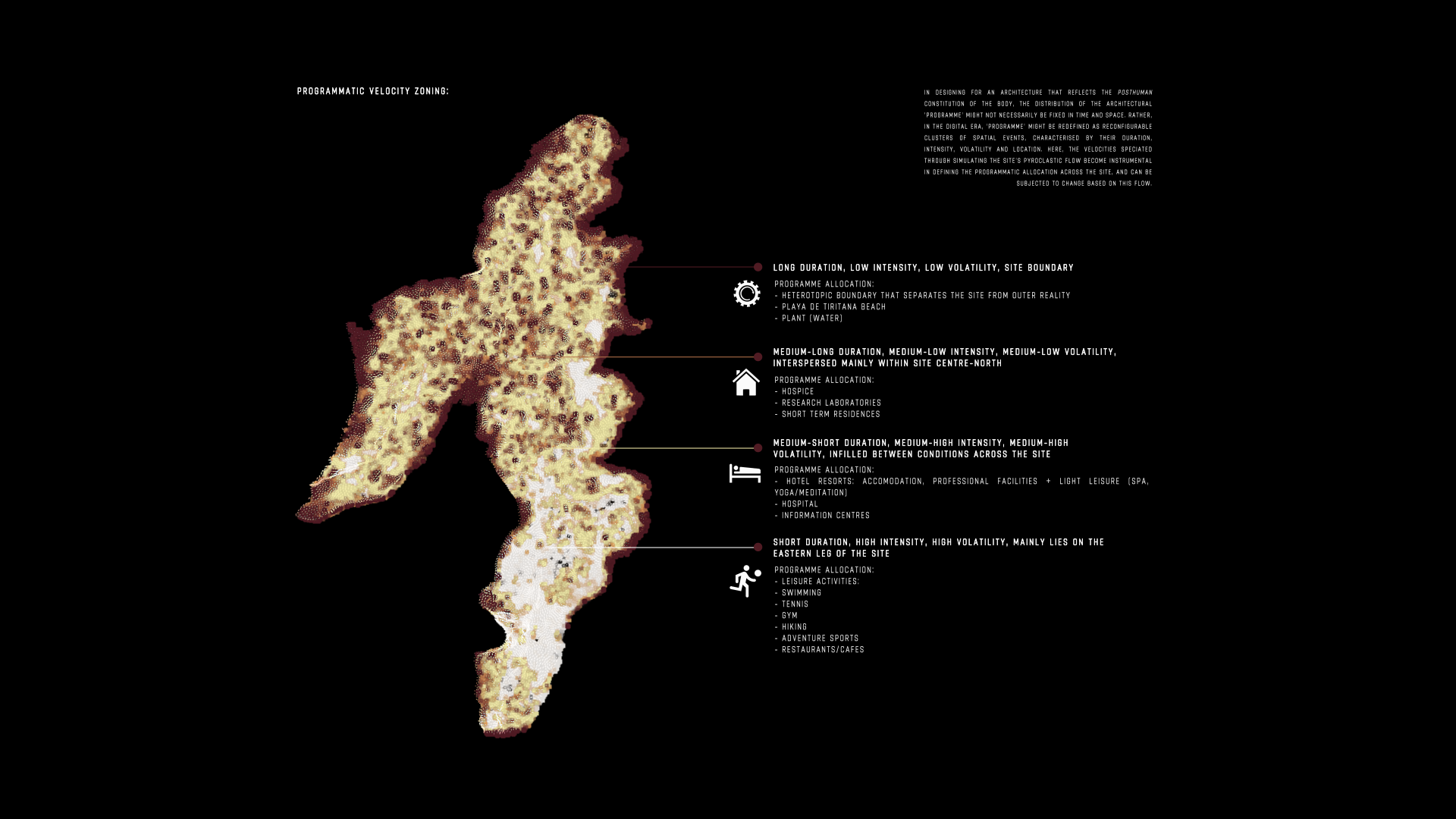 According to the initial velocity attributes, the machine carves out slows paces like balconies and courtyards, and water monitoring wells that mediate the aridness of the Gran Canarian landscape. The machine then hallucinates the infinite possible variables of the site according to the simulation - this resort is just one of them, frozen in time. The velocity attributes are then used to carve out programmatic zones, where programme is understood as spatial events characterised by their volatility, duration and intensity.