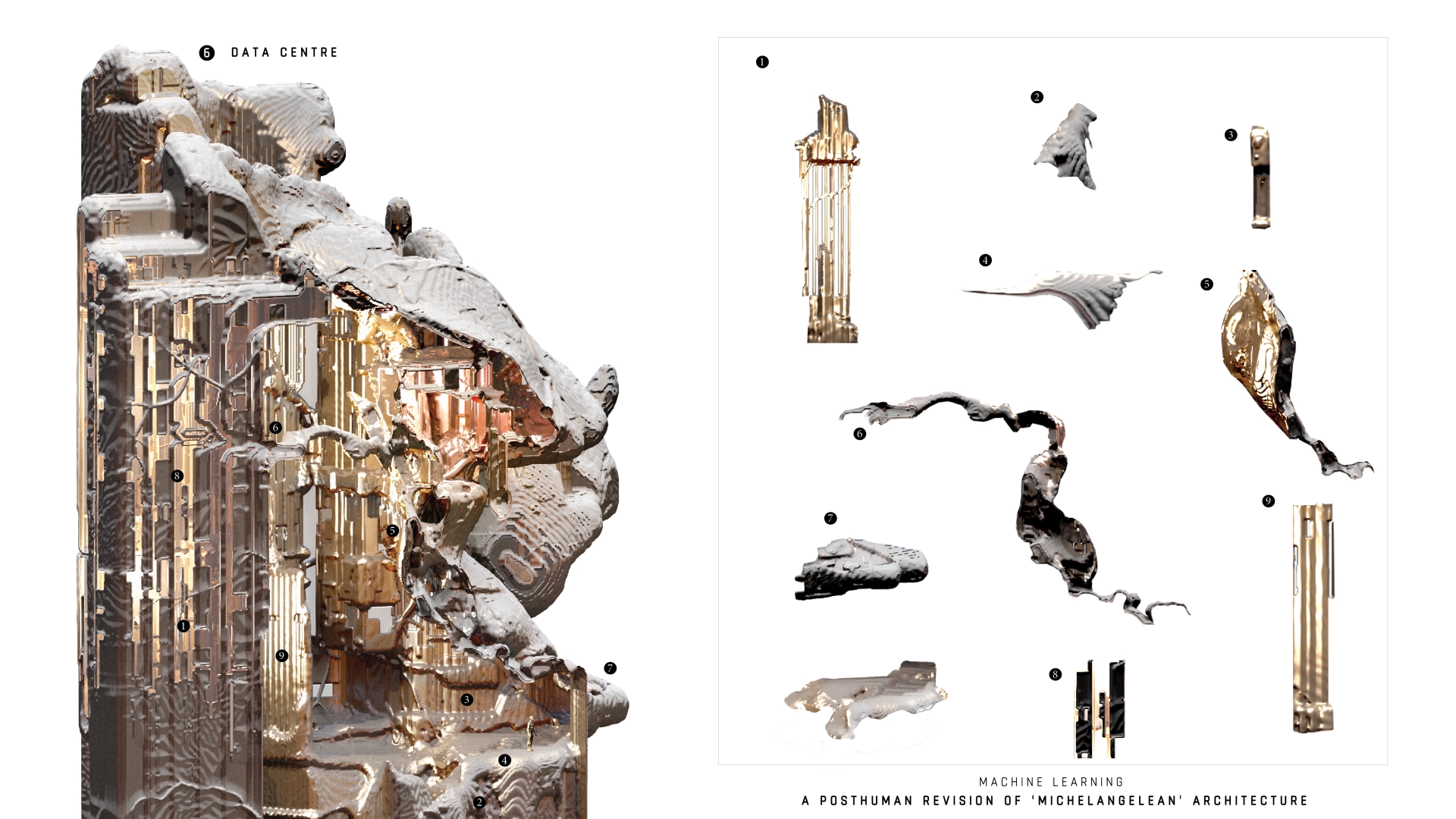 Each building on the site has two binary conditions - its colour coded, voxelised existence in the virtual domain, and its material reality that negotiates stone, marble, glass and vegetation. In an architecture generated instantaneously, however, the buildings lack history or accumulated meaning. Through machine learning, the building voxels draw associations between their own architecture and existing records - describing its architecture as if it were an organism, or as a posthuman revision of ‘Michelangelean’ media.