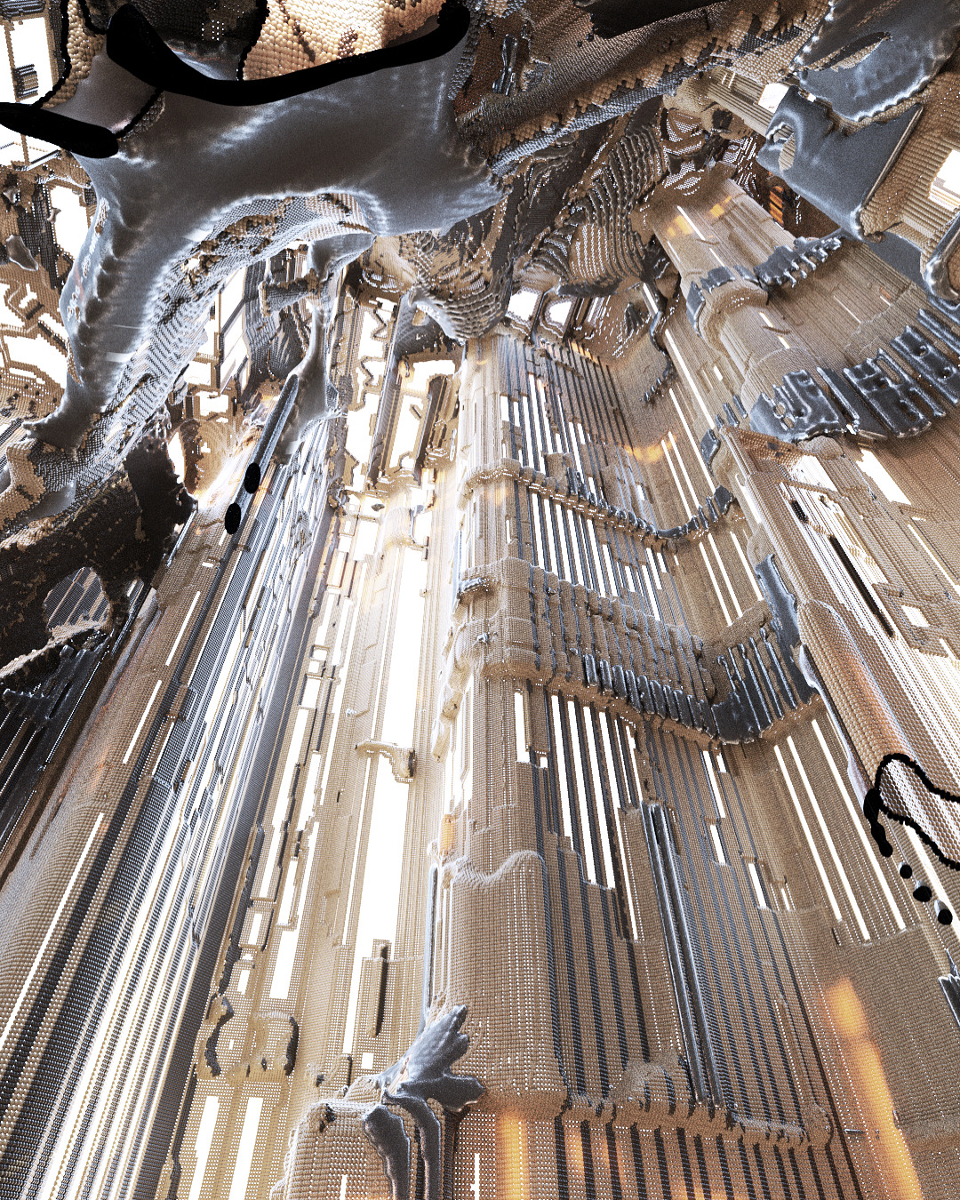 The morphologies of the buildings are designed such that their surface area is increased through their outward extrusion, creating more interfaces for the virtually curated environment to operate.